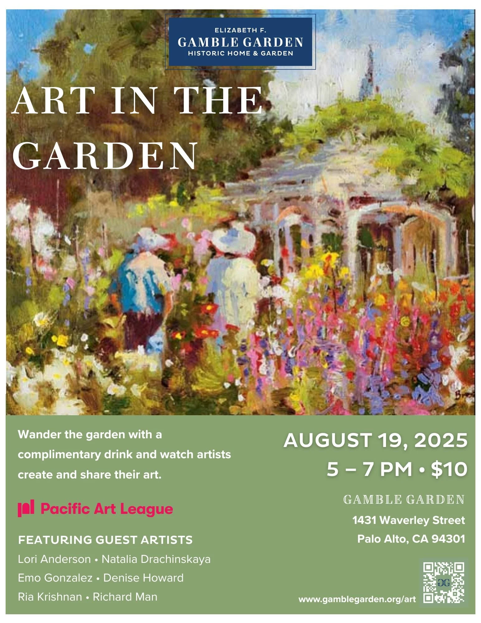 This year, PAL is thrilled to collaborate with Gamble Garden on their annual Art in the Garden event—happening Tuesday, August 19th from 5:00–7:00 PM in Palo Alto.