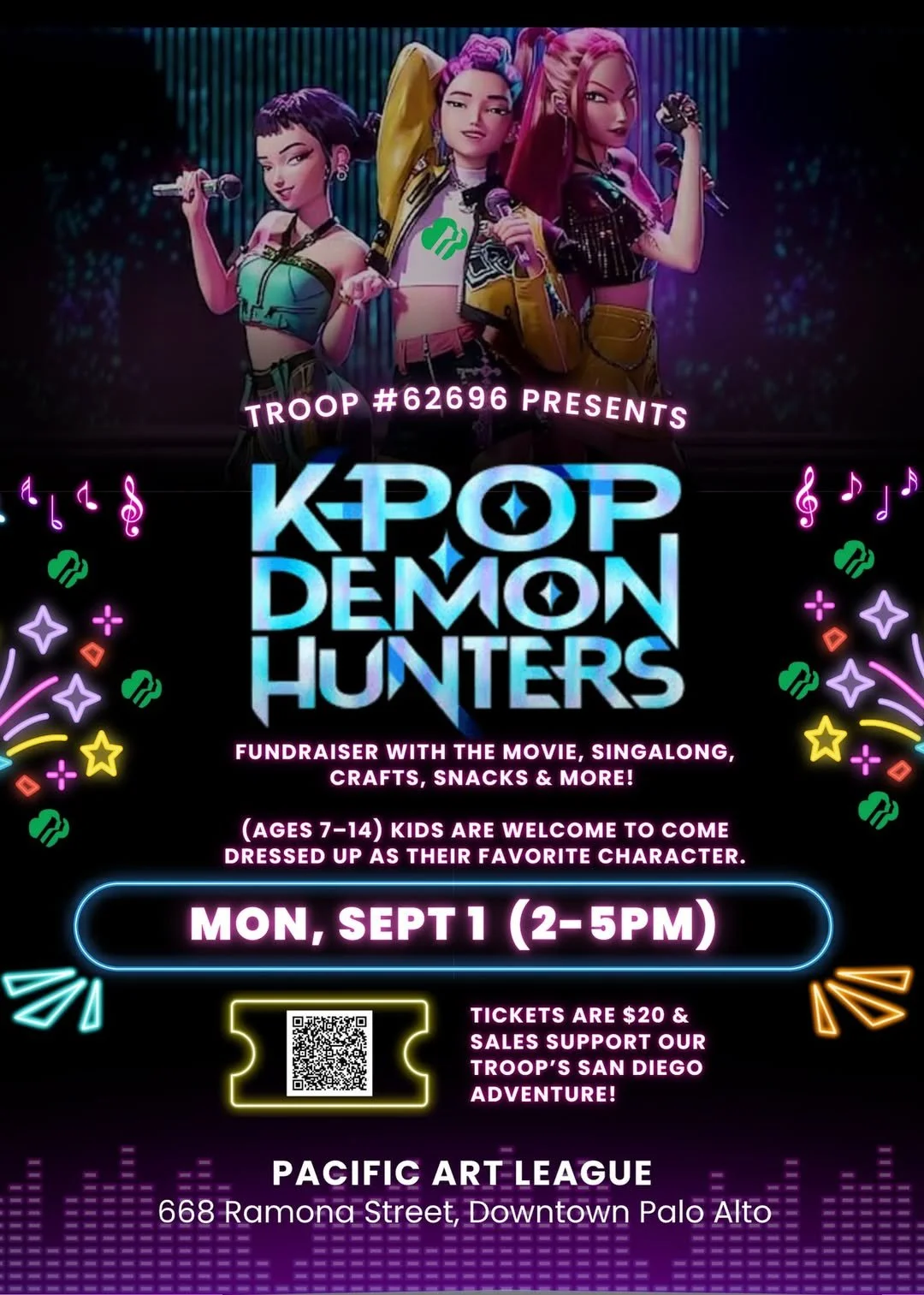 La Entrada’s (Menlo Park) 8th Grade Girl Scout Troop (#62696) is hosting a special school holiday fundraiser on Monday, Sept 1st—featuring a movie watch party + singalong, along with fun crafts and snacks!