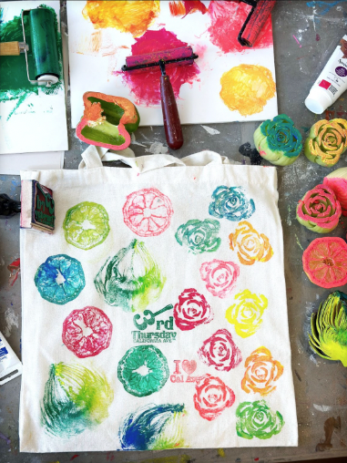 Join us at the PAL art table and make your ownVegetable Block Print onto Canvas Bags, celebrating TheTaste of Cal Ave, a 3rd Thursday fundraiser which showcases the restaurants and bars on Cal Ave.